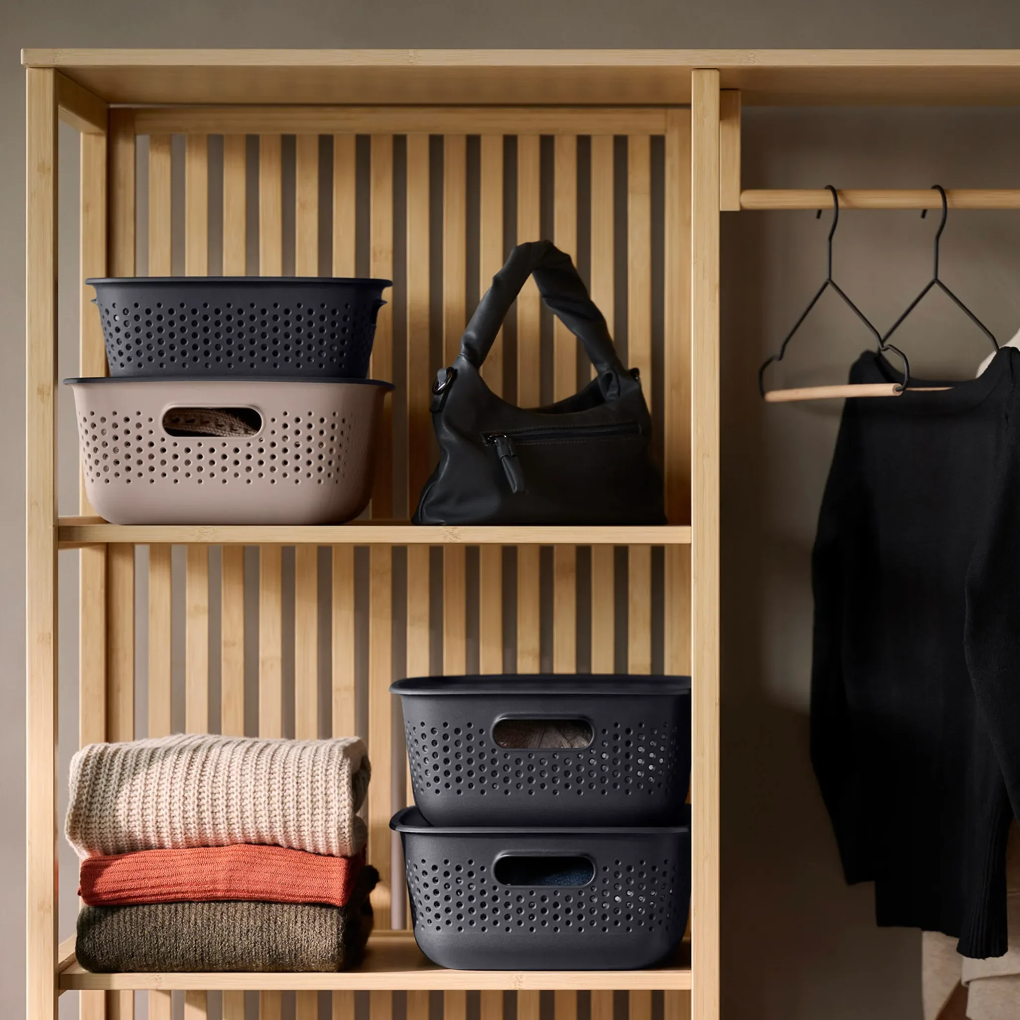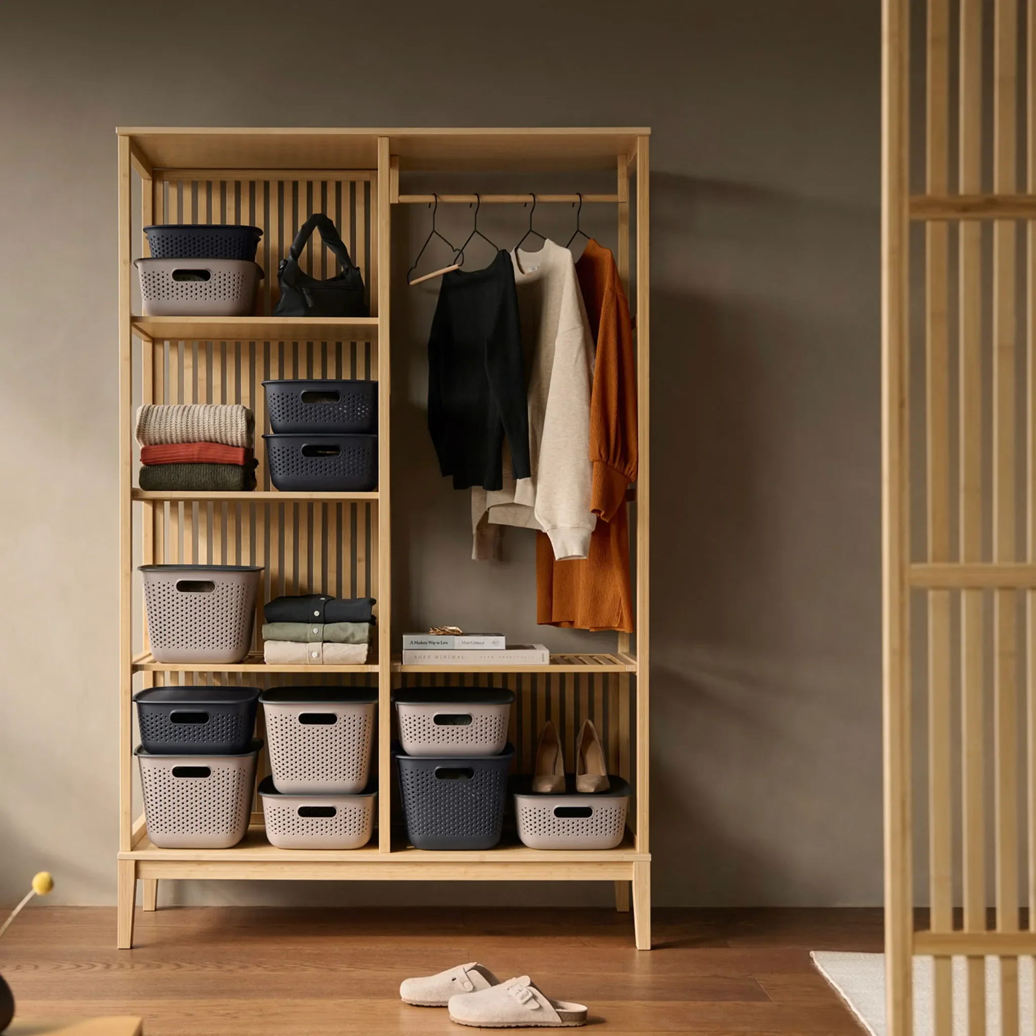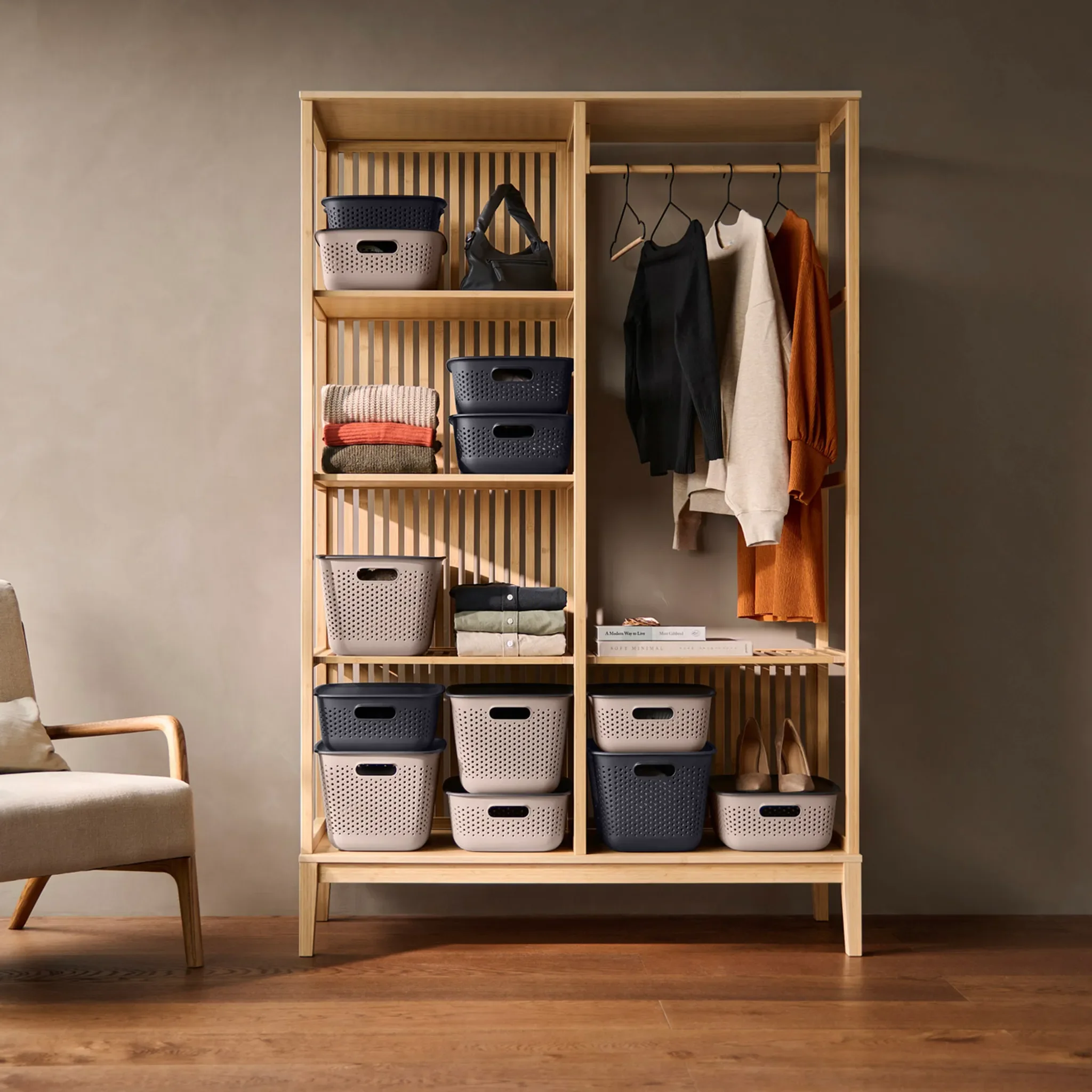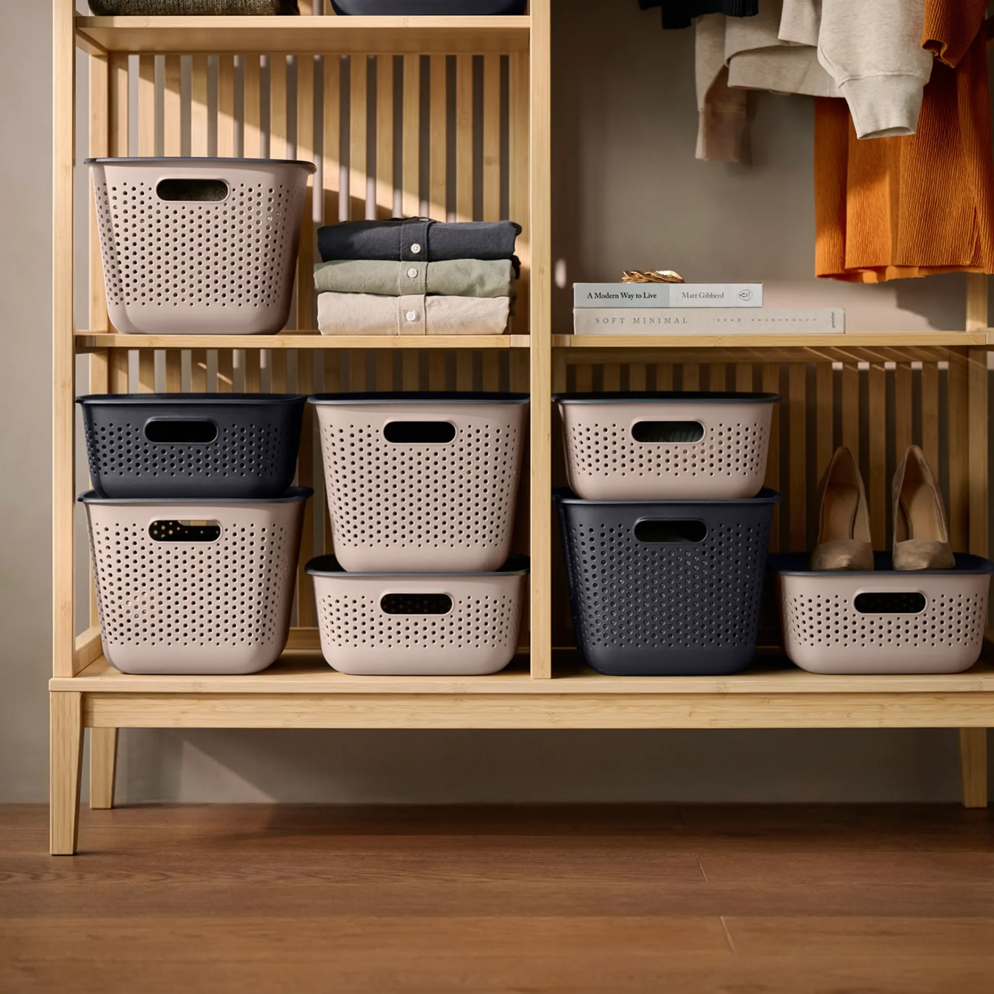 Diese hellbraune Aufbewahrungsbox aus hochwertigem Kunststoff bietet eine elegante und praktische Lösung, um Ordnung in Küche, Büro, Badezimmer oder Garage zu schaffen. Sie ist durchbrochen, hat ergonomische Griffe und ein Fassungsvermögen von 3,5 Litern.
