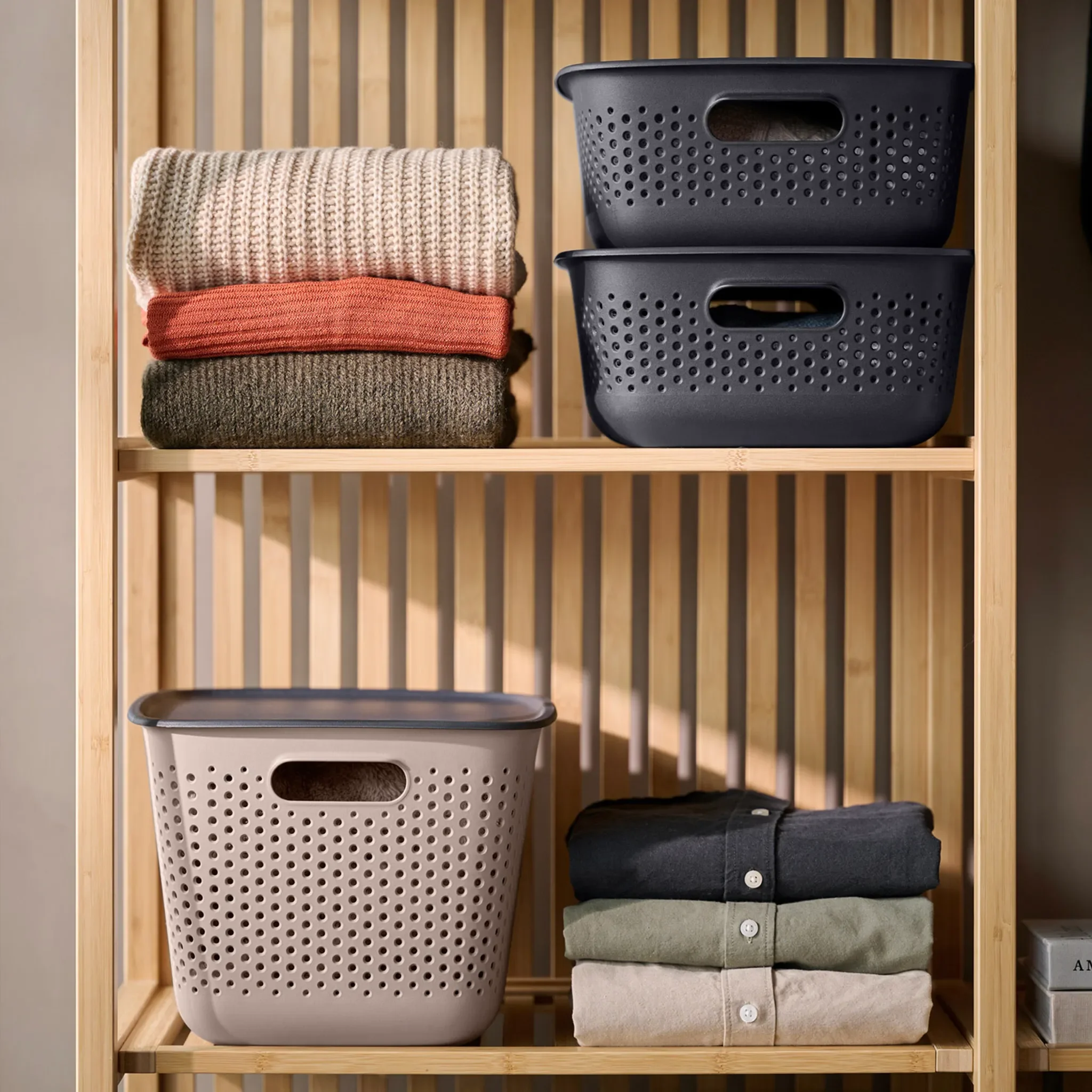 Die anthrazitfarbene Aufbewahrungsbox mit Deckel und seitlichen Griffen eignet sich optimal zur ordentlichen Aufbewahrung von Haushaltsgegenständen, Werkzeug, Kosmetik oder Lebensmitteln. Das durchbrochene Design sorgt für Belüftung und eine moderne Optik.