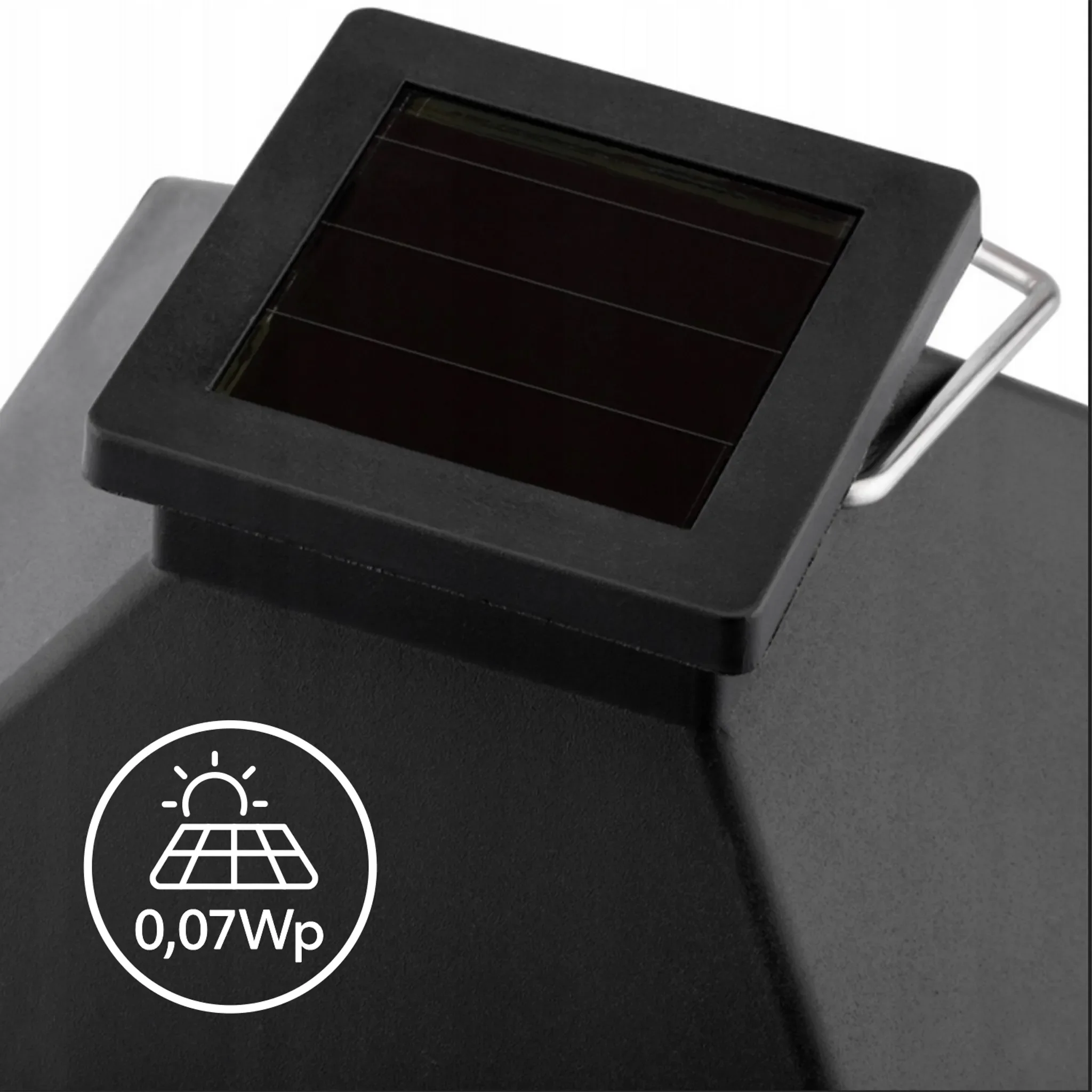 Highlights: Warmweißes, atmosphärisches Licht, effiziente Solartechnik, automatische Einschaltung bei Dunkelheit, wetterfest nach IP44, vielseitig einsetzbar, dekoratives schwarzes Laternen-Design aus Kunststoff und Glas.