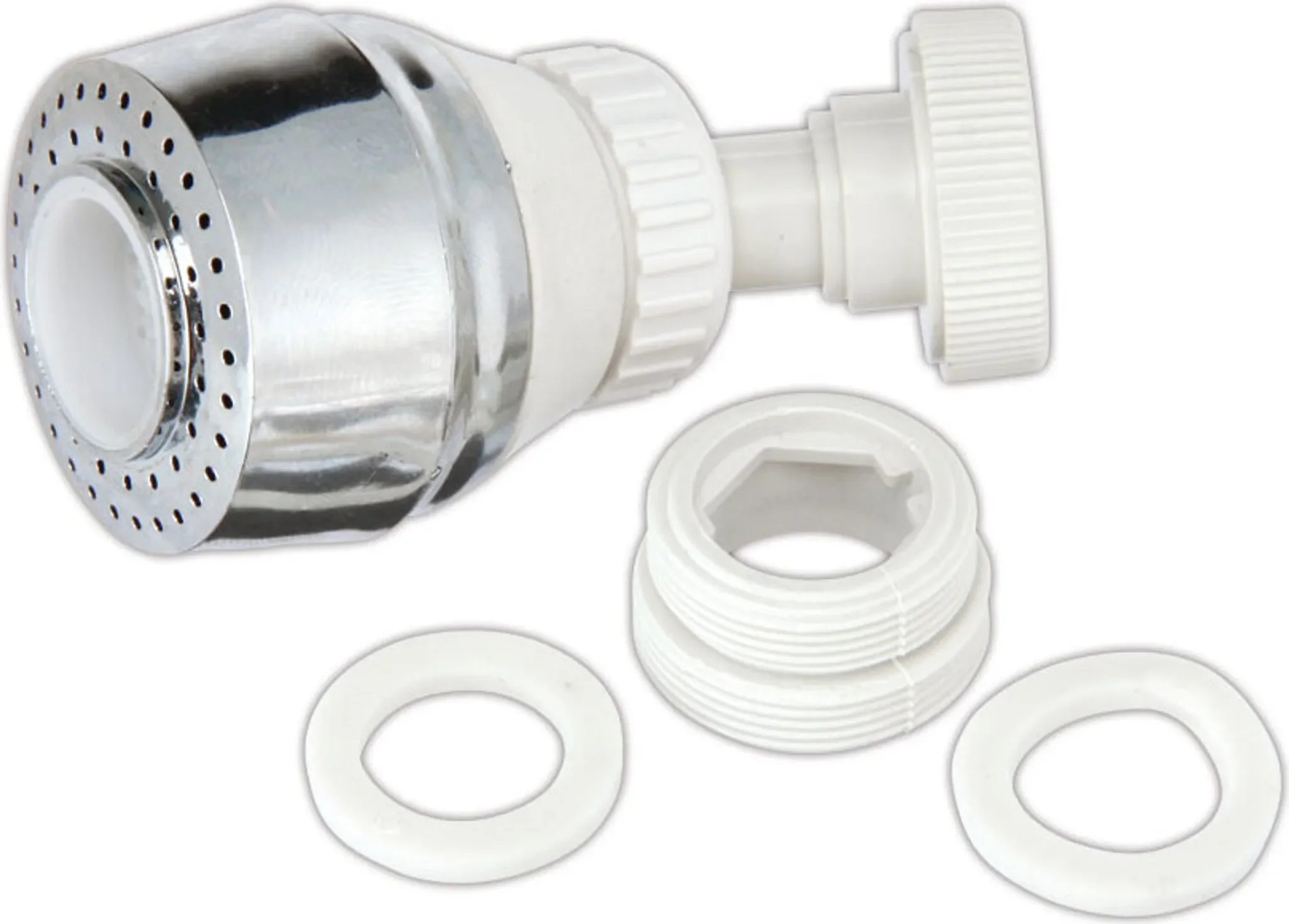 Der schwenkbare Kugel-Strahlregler von EUROTOOLS ist ein vielseitiger Wassersparer für Küche und Bad. Dank Kugelkopf ist der Strahlaufsatz um 360° schwenkbar und erleichtert das Reinigen von Geschirr, Spüle oder Waschbecken. Durch einfaches Ziehen am verchromten Ring lässt sich komfortabel zwischen Normalstrahl und Brausestrahl umstellen.