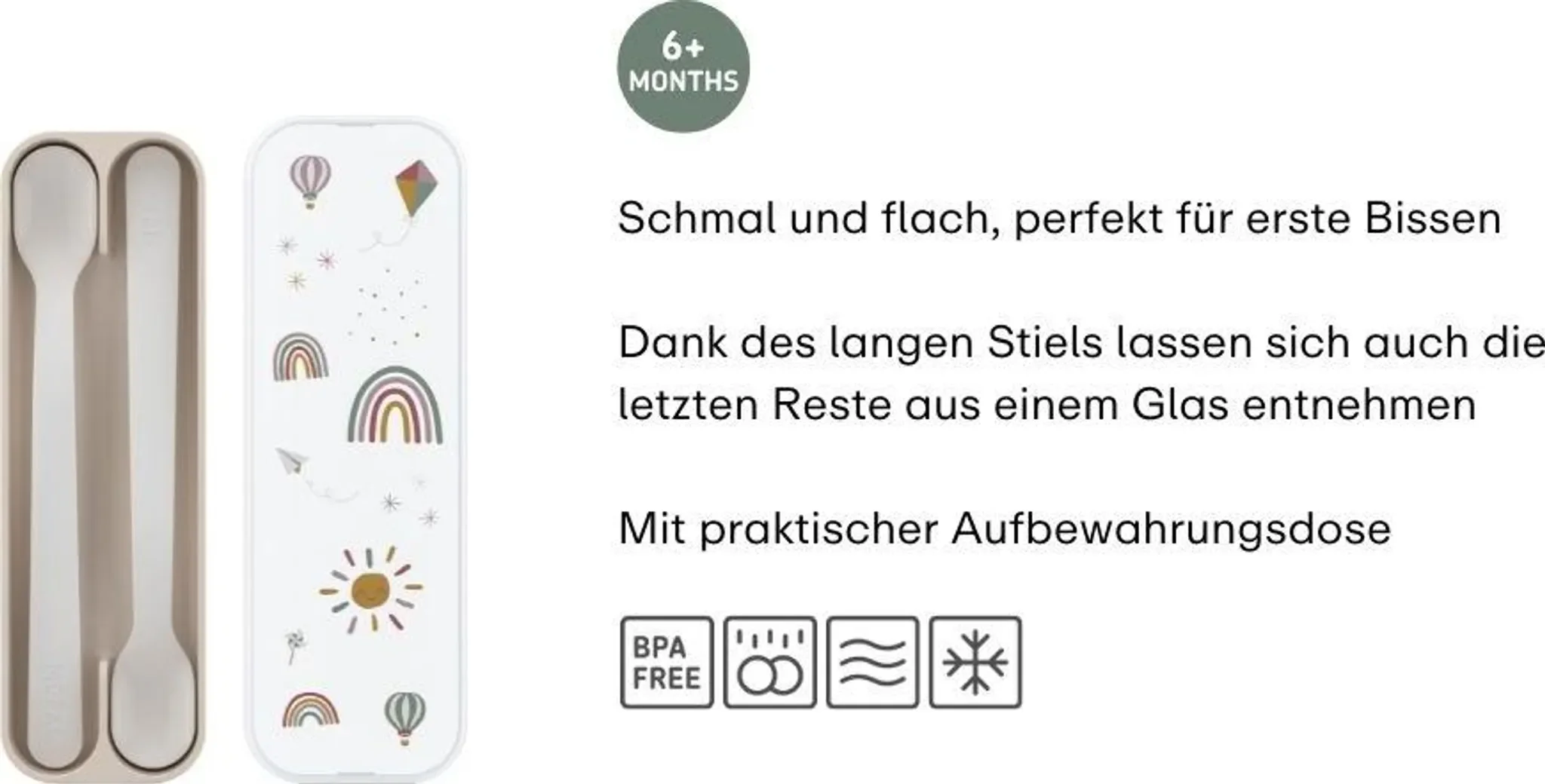 Die extra schmale Löffelform ist speziell auf kleine Babymünder abgestimmt, während der extra lange Stiel dafür sorgt, dass du auch den letzten Rest aus Brei- oder Joghurtgläschen problemlos erreichst. Die Löffel sind BPA-frei, spülmaschinengeeignet und damit besonders alltagstauglich, hygienisch und sicher – empfohlen für Babys ab etwa 4 Monaten.