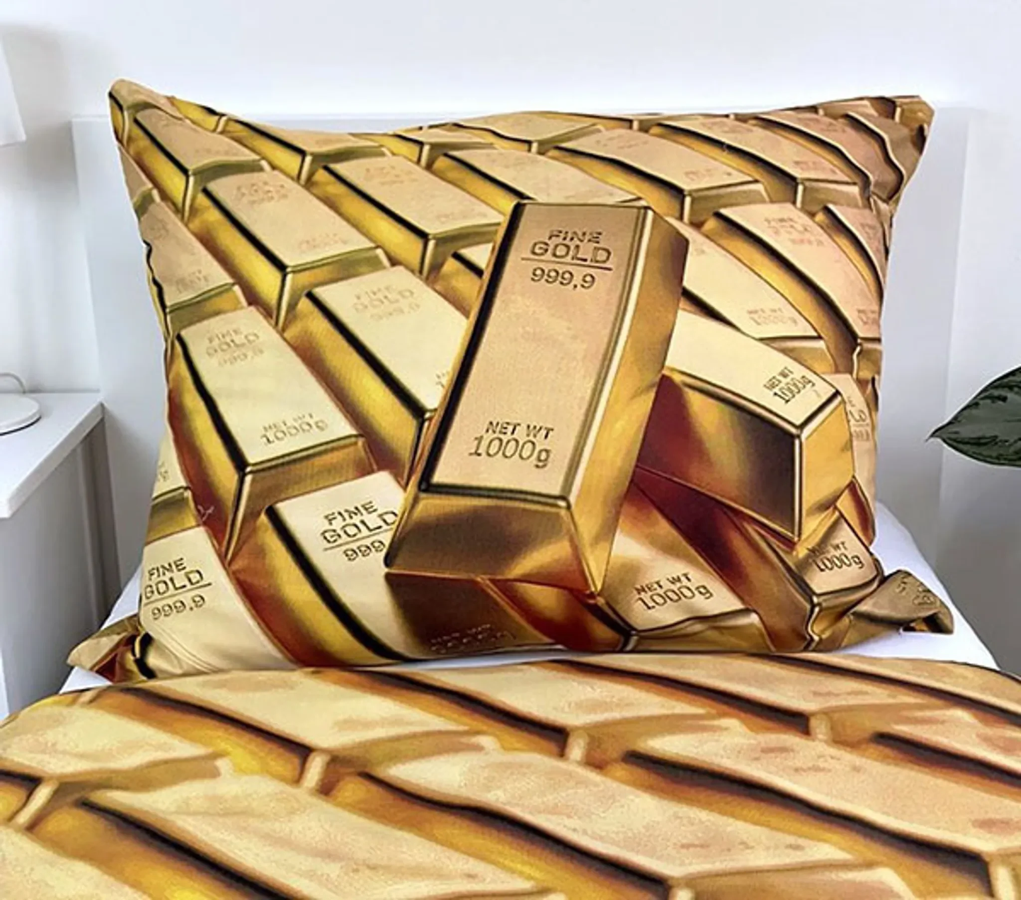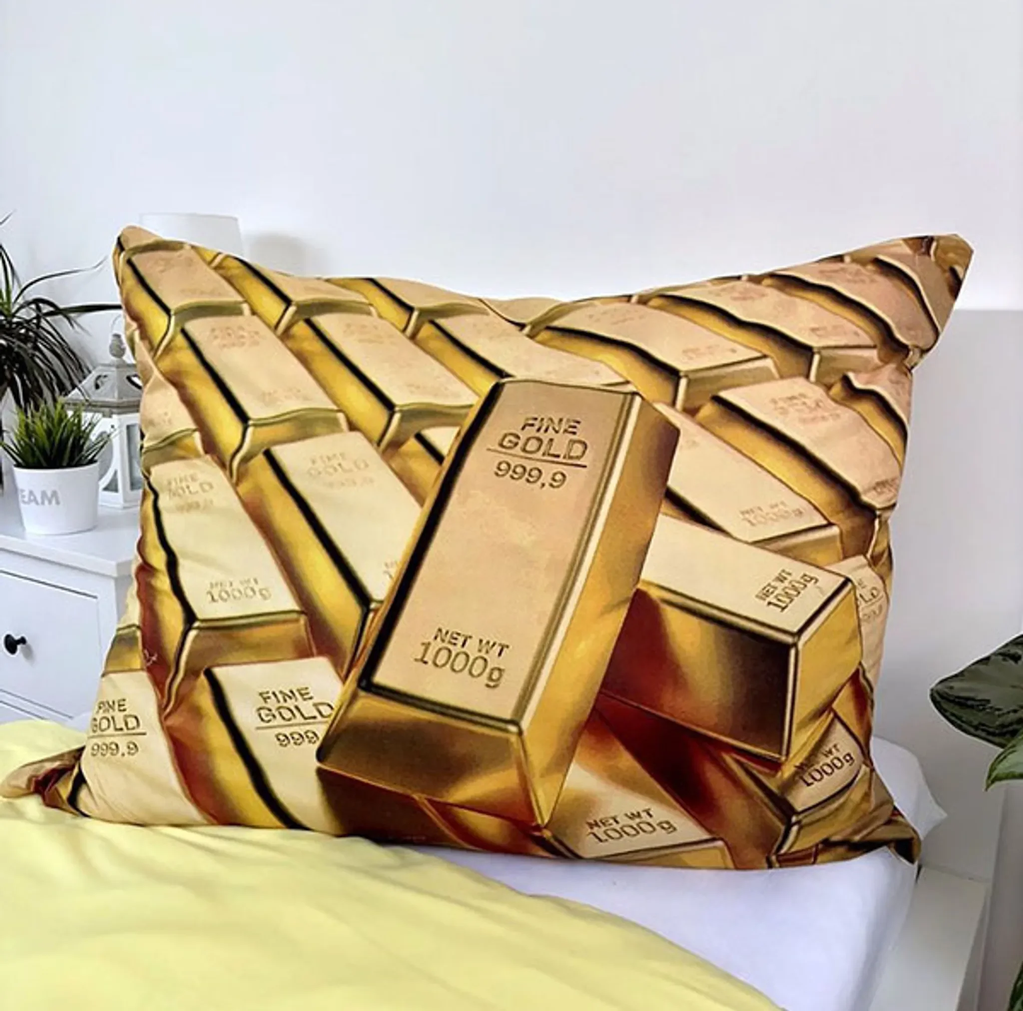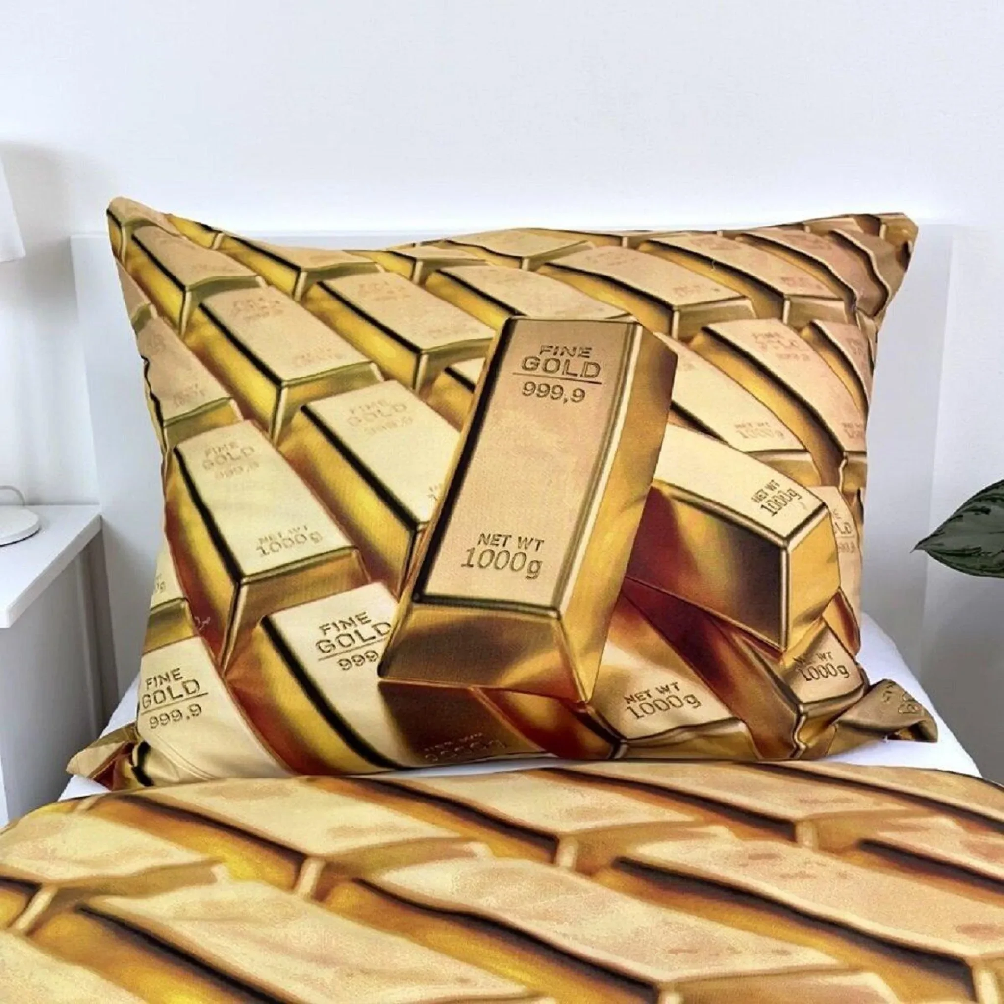 Diese eindrucksvolle Bettwäsche im Goldbarren-Design ist ein echter Blickfang und sorgt für eine besondere Atmosphäre im Schlafzimmer. Das weiche Material aus 100% Polyester fühlt sich angenehm kuschelig an und eignet sich ideal für kühle wie warme Nächte.