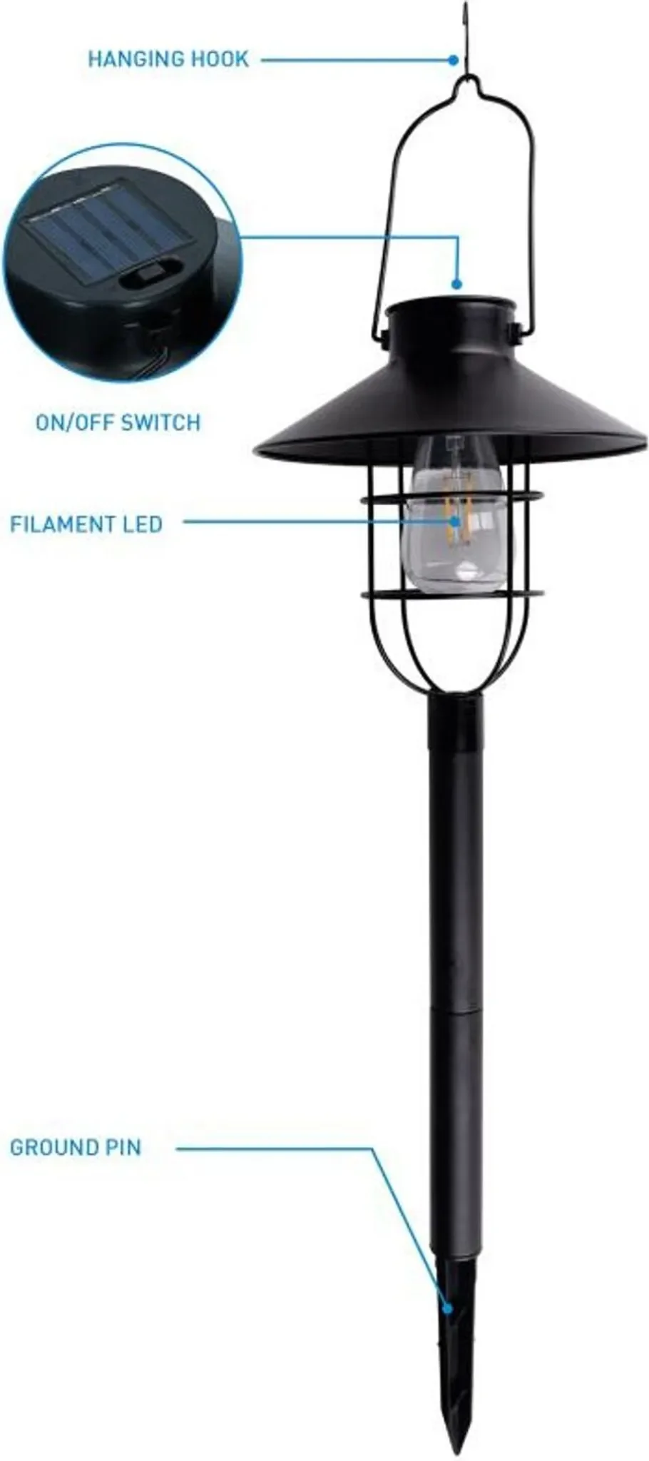 Solarbetriebene Gartenlaterne • Filament-LED in Retro-Optik • 2-in-1: Hängen oder Stecken • Warmweißes Licht für 6–8 Stunden