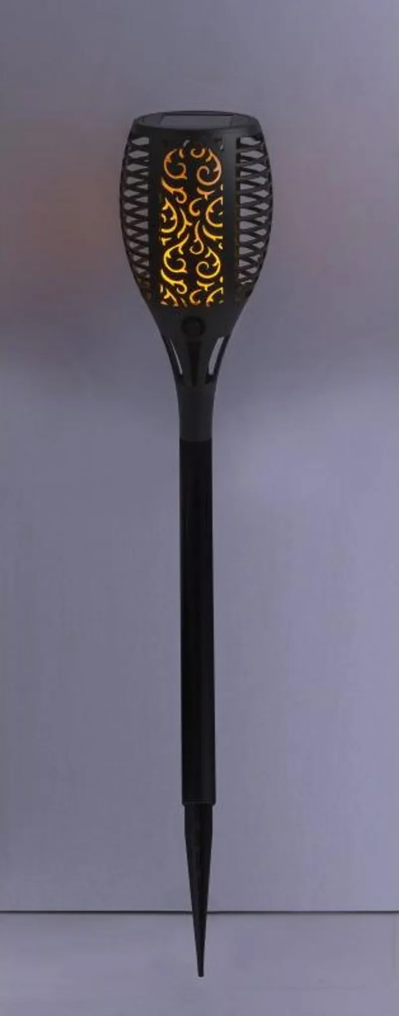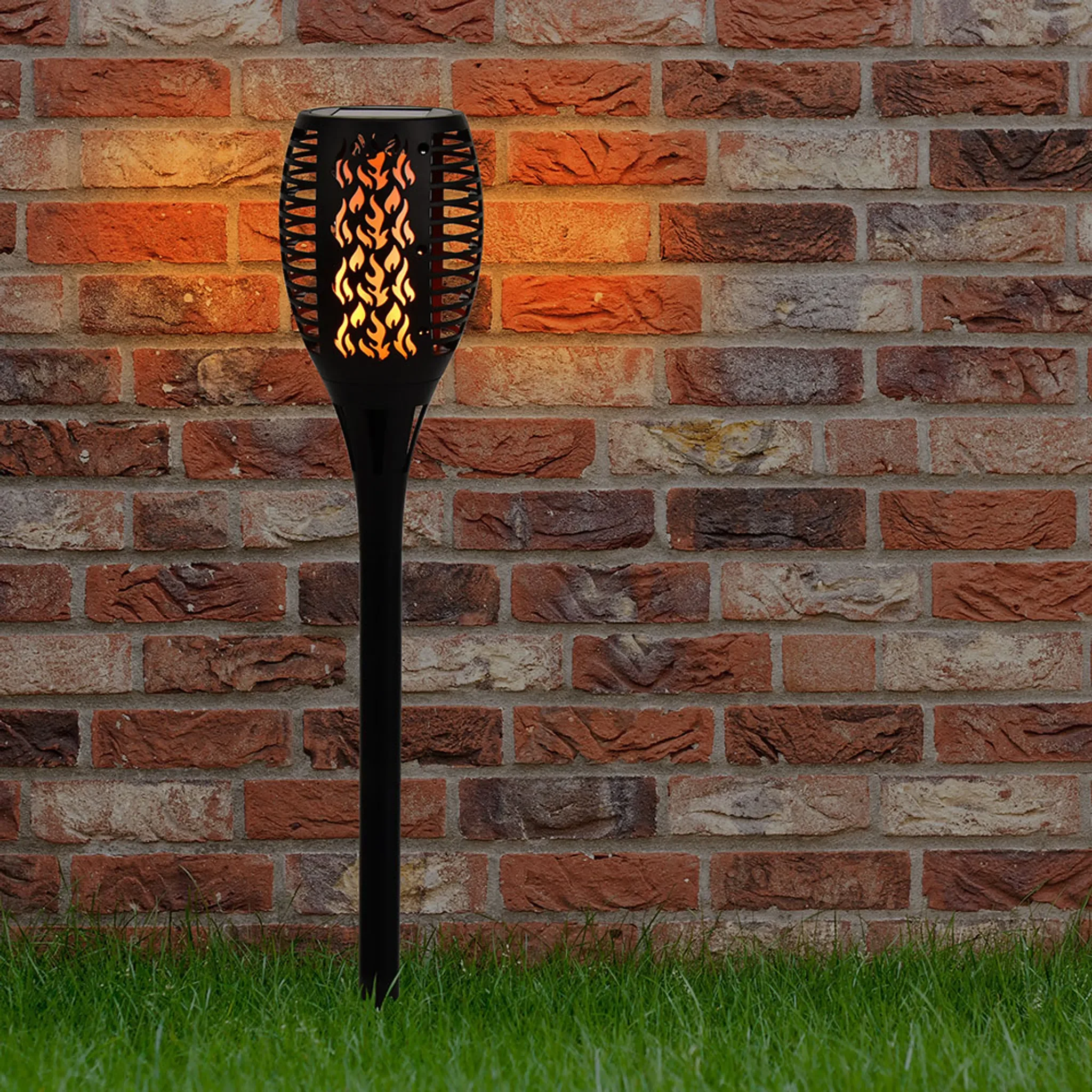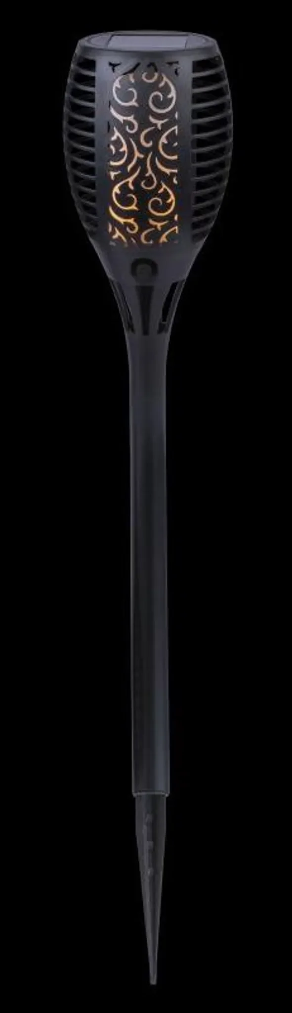 Diese Solar-Fackelleuchte aus schwarzem Kunststoff sorgt mit ihrem realistischen Flammeneffekt für eine stimmungsvolle Beleuchtung im Außenbereich. 36 warmweiße LEDs (ca. 1800 K) simulieren das flackernde Licht einer echten Fackel und schaffen eine gemütliche Wohlfühlatmosphäre – ideal für Garten, Terrasse, Balkon oder Wege.