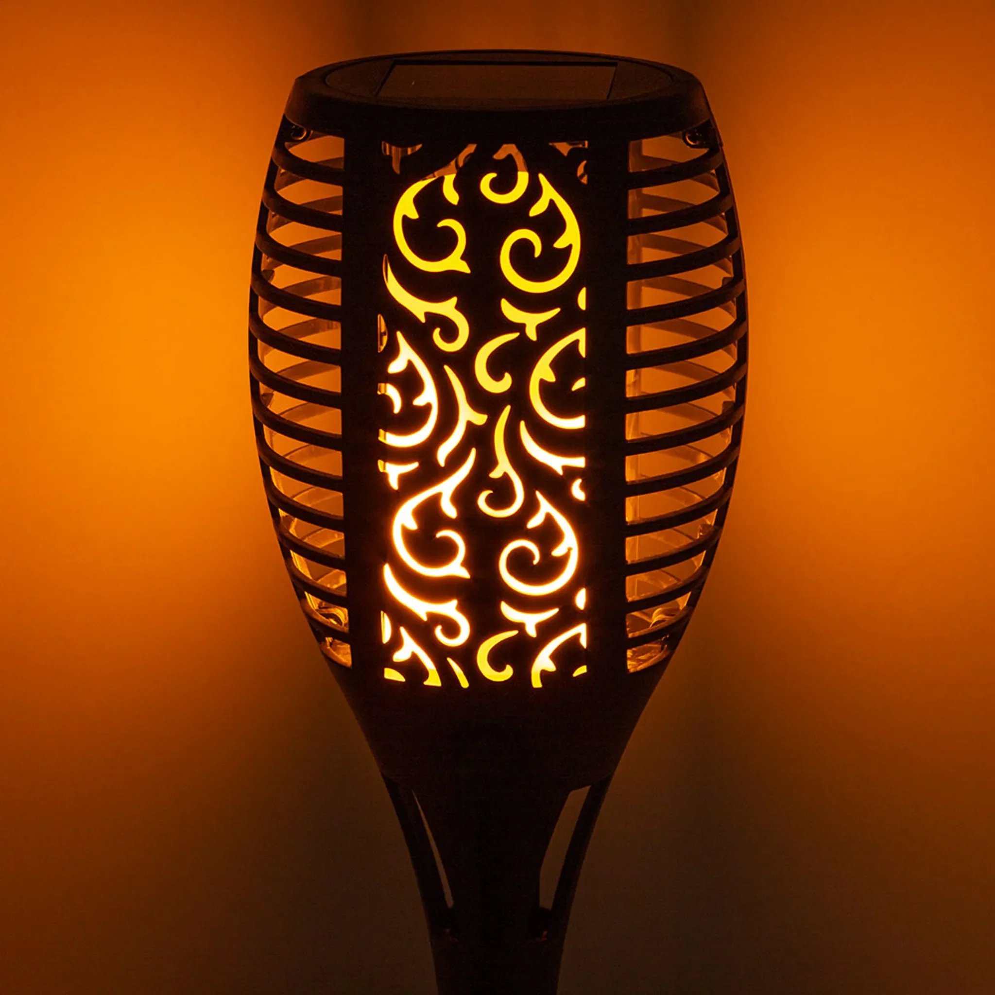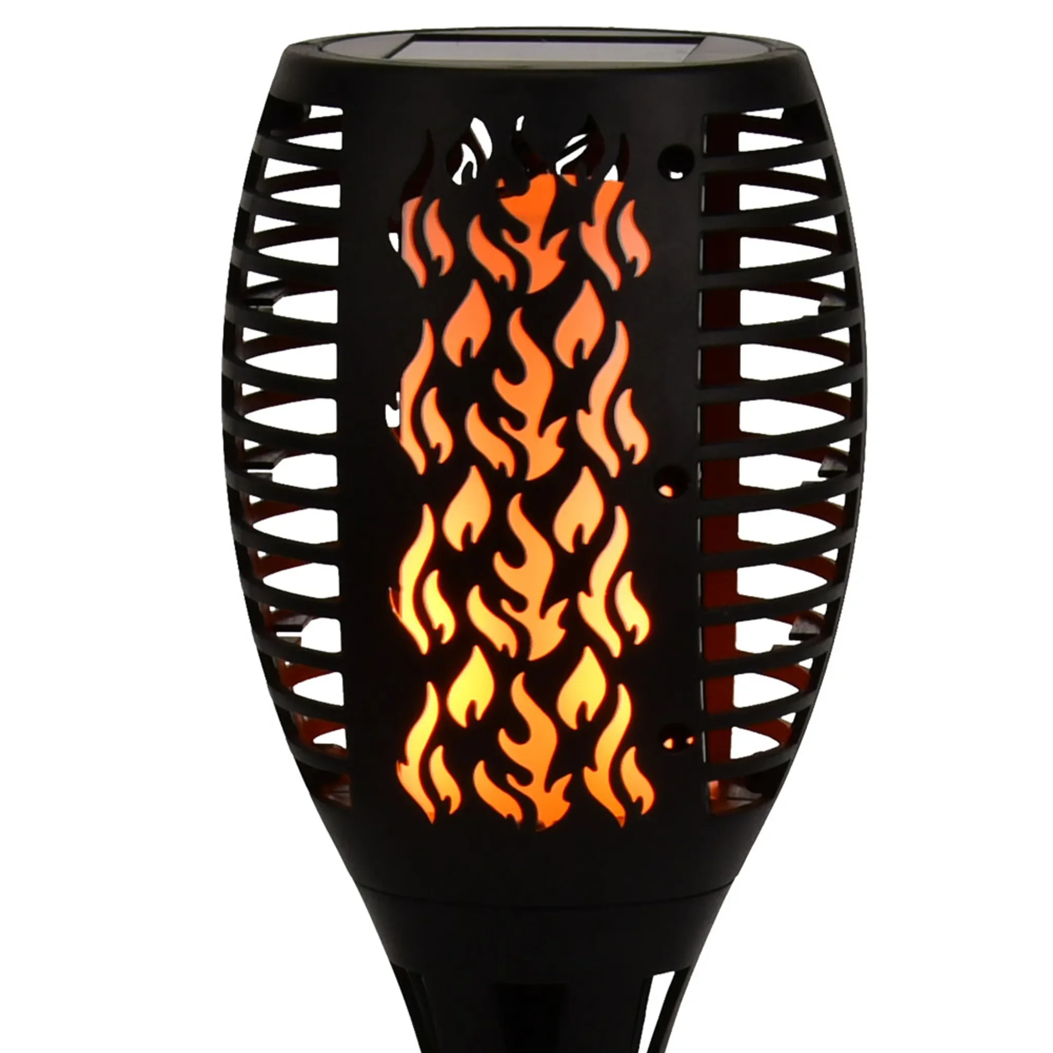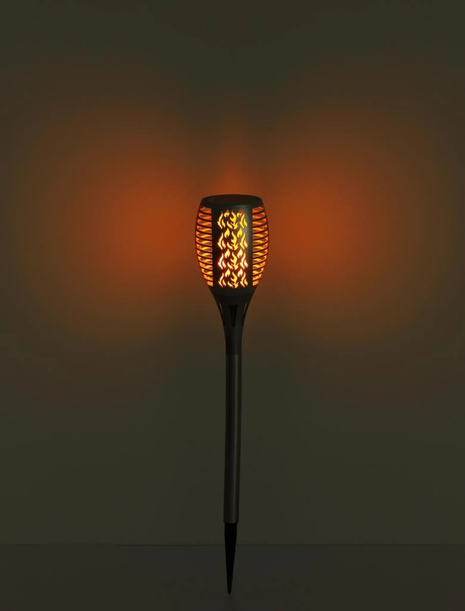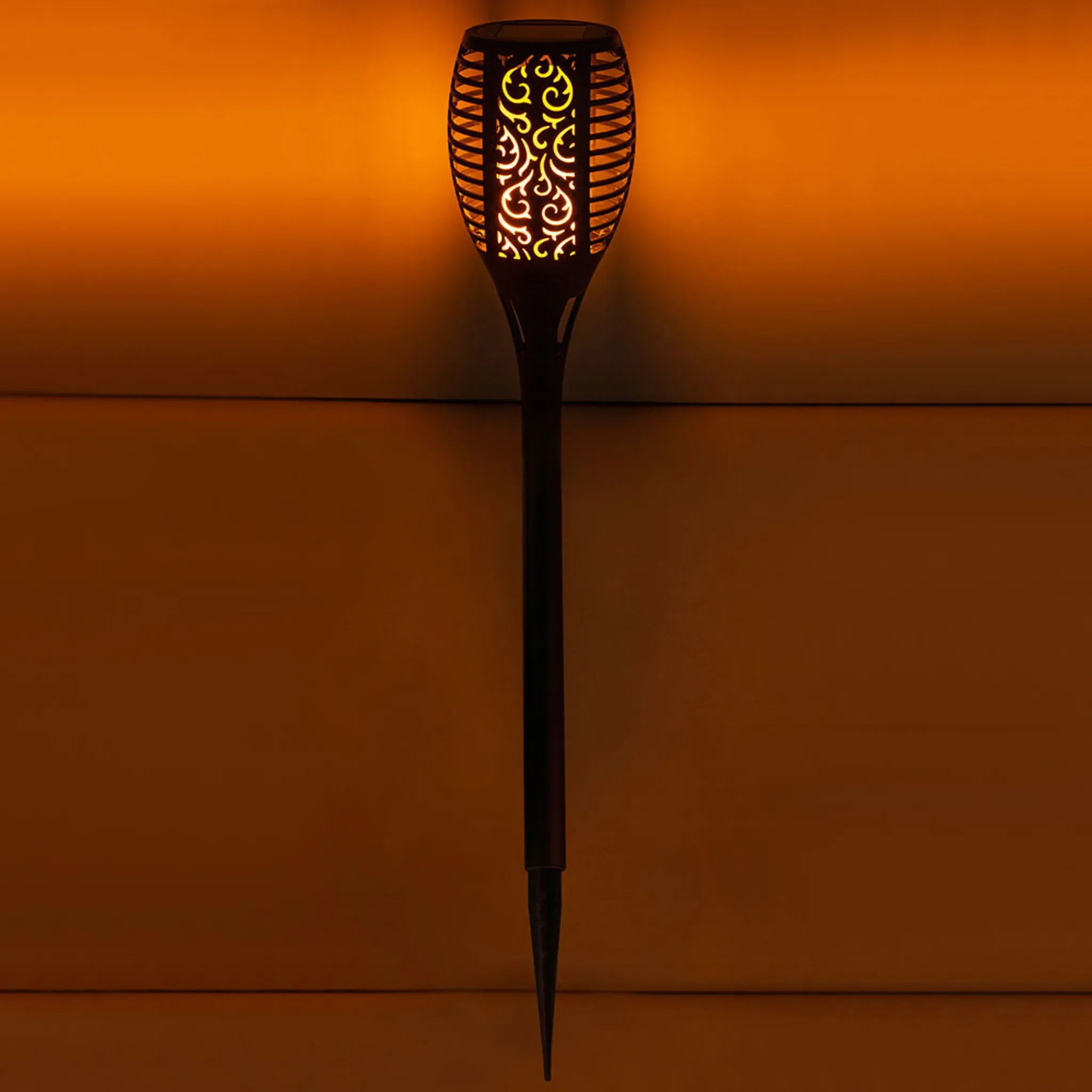 Diese Solar-Fackelleuchte aus schwarzem Kunststoff sorgt mit ihrem realistischen Flammeneffekt für eine stimmungsvolle Beleuchtung im Außenbereich. 36 warmweiße LEDs (ca. 1800 K) simulieren das flackernde Licht einer echten Fackel und schaffen eine gemütliche Wohlfühlatmosphäre – ideal für Garten, Terrasse, Balkon oder Wege.