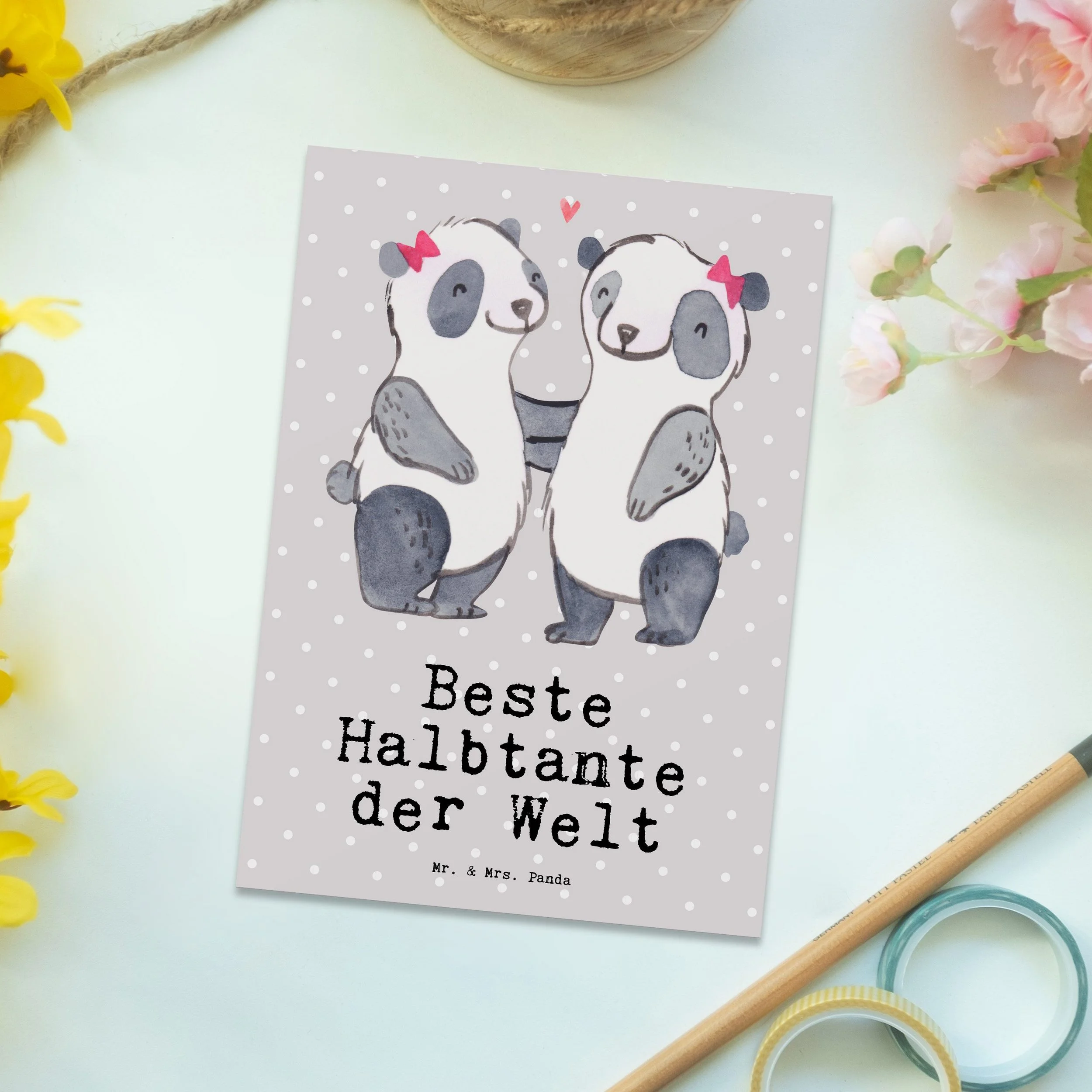 Postkarte „Panda – Beste Halbtante der Welt“ – DIN A6, Grau Pastell