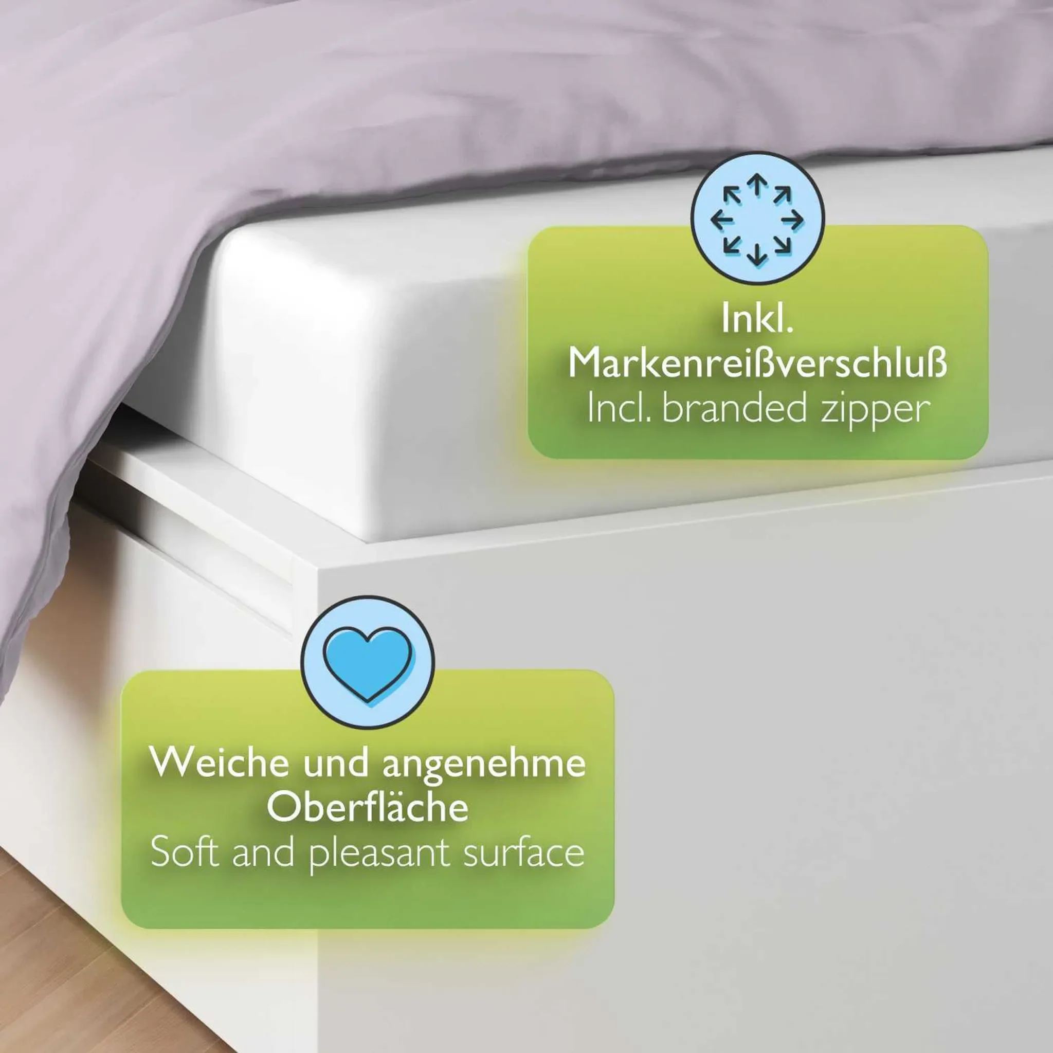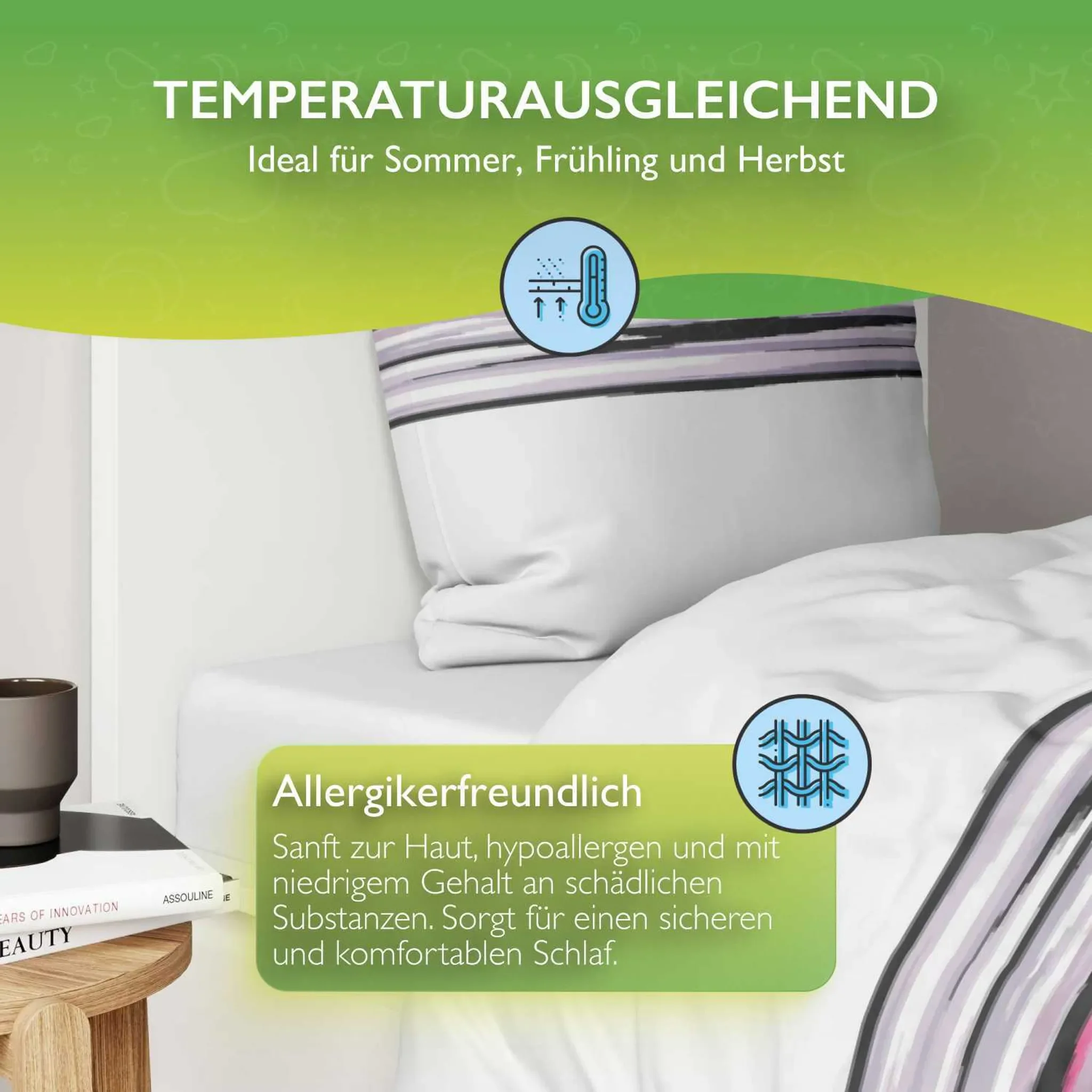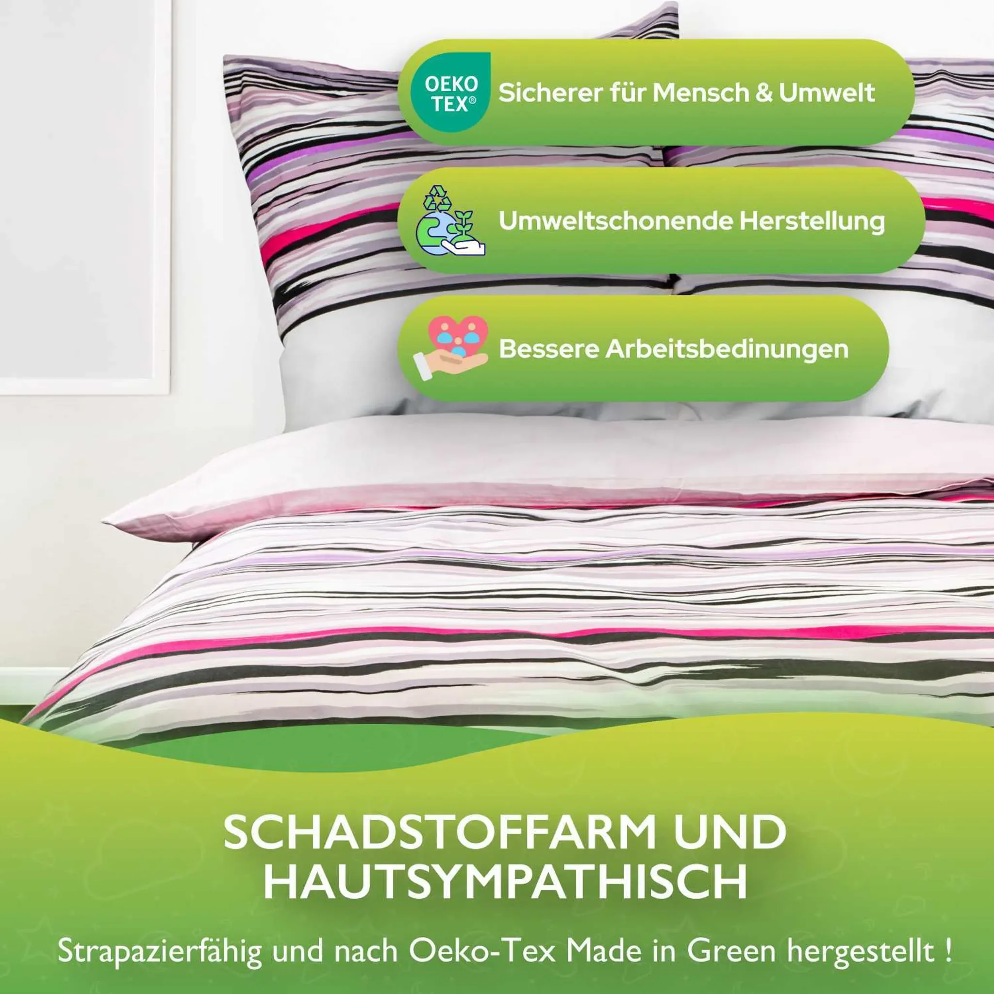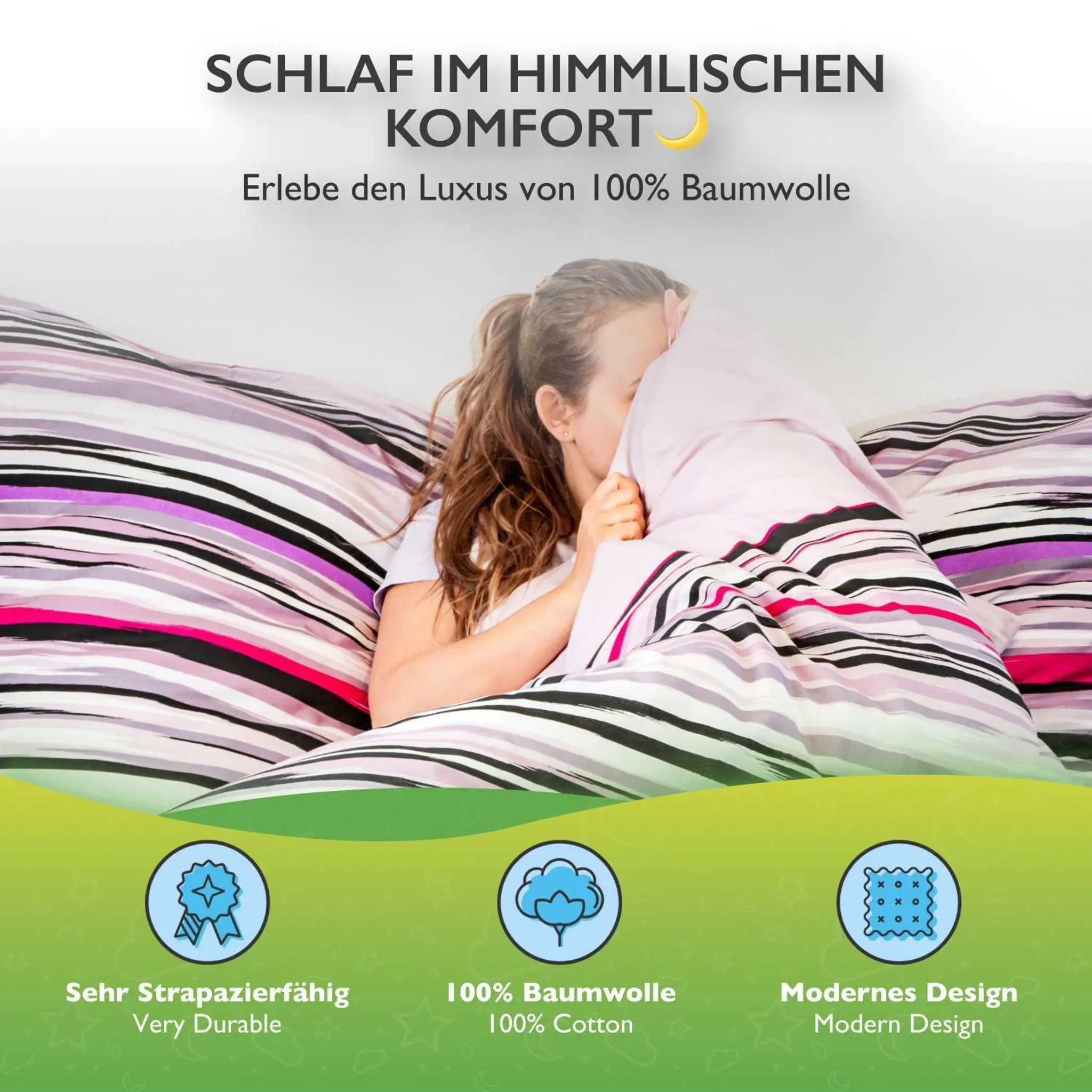 Die natürliche Baumwolle nimmt Feuchtigkeit optimal auf und sorgt dank ihrer temperaturausgleichenden Eigenschaften sowohl im Sommer als auch im Winter für ein angenehmes Liegegefühl. Das moderne Streifendesign in Violett bringt frische Akzente in jedes Schlafzimmer.